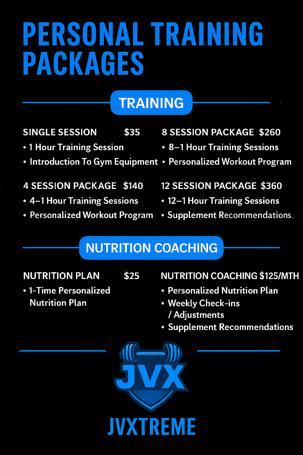 A promotional poster for personal training packages and nutrition coaching at JVXTREME. It details pricing and options for single sessions, package deals, and nutrition plans, including session durations and features.